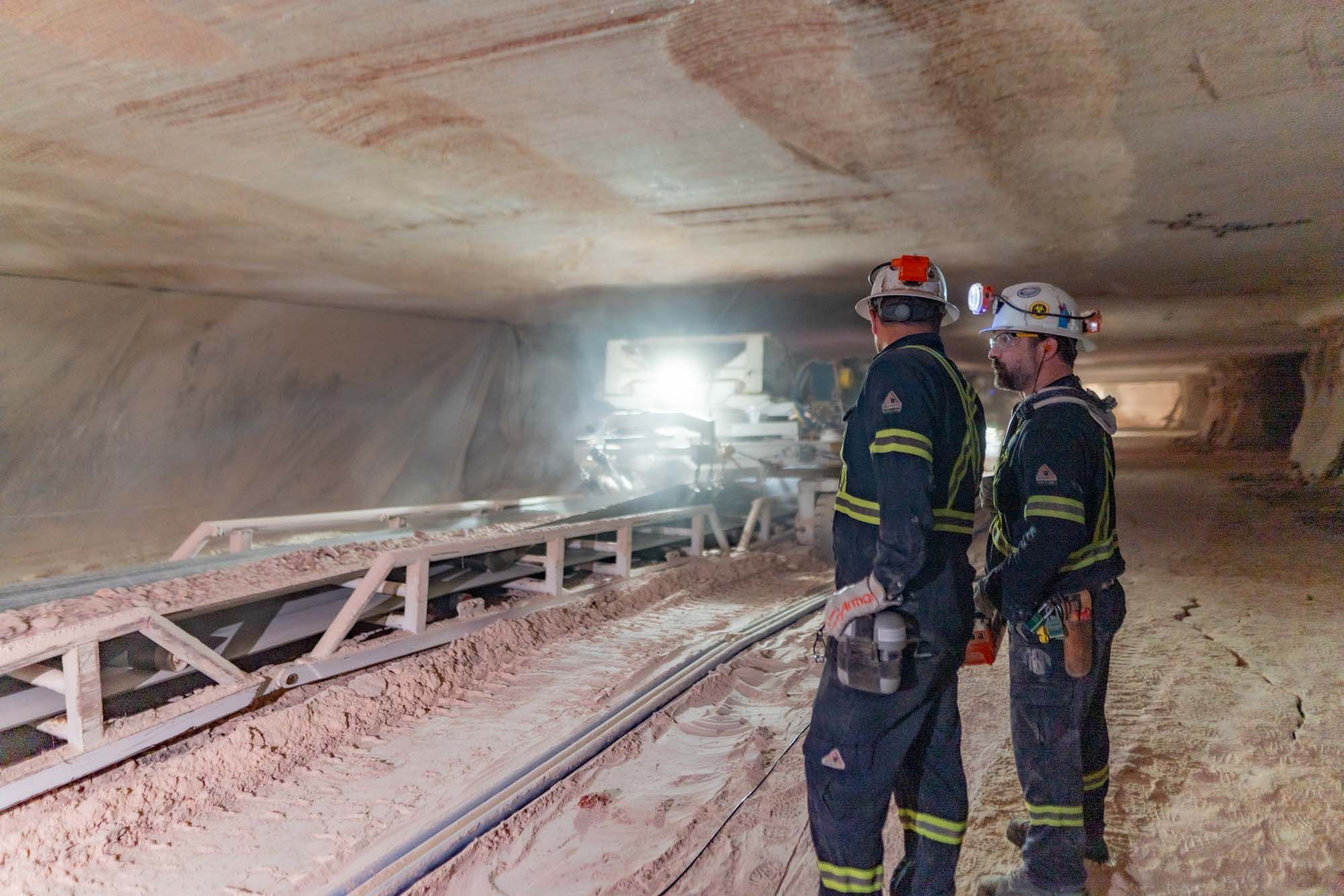 Two Nutrien employees watch potash get hauled away on a conveyor belt.