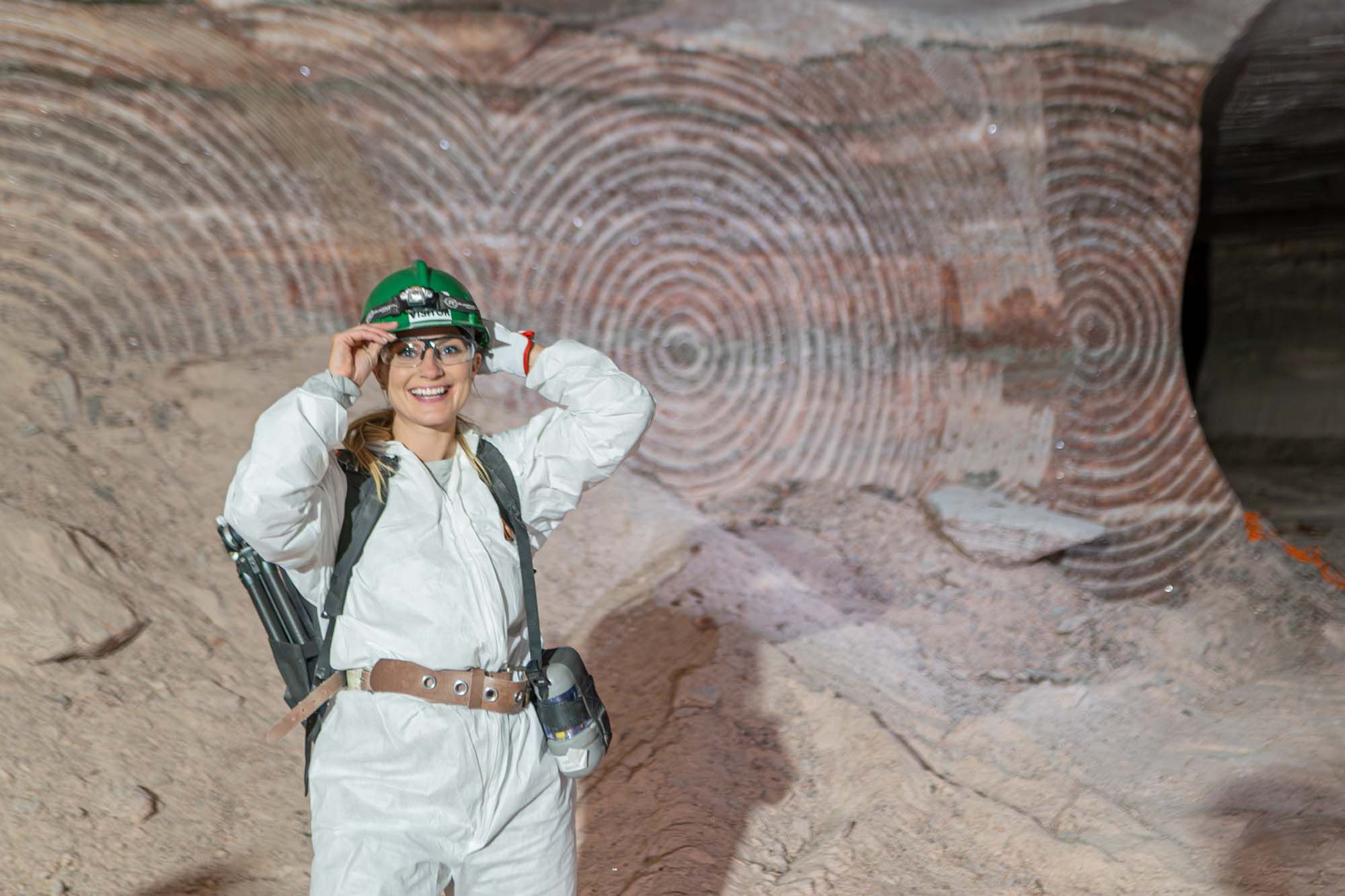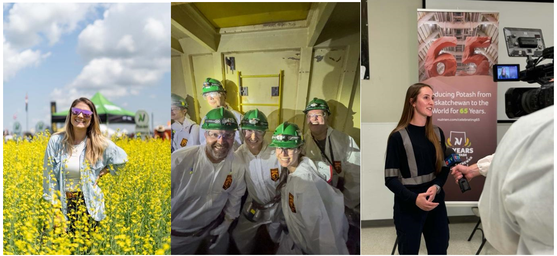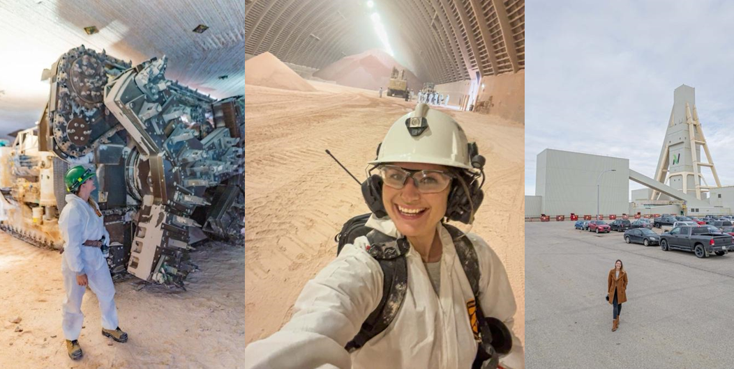 Ashlyn underground next to the boring machine, inside a potash storage facility, and aboveground in front of Nutrien’s mainframe.