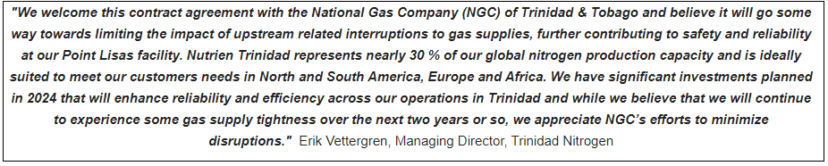 In the case of Nutrien, the supply of natural gas from NGC will support the company’s four anhydrous ammonia plants and one urea plant, all located at the Point Lisas Industrial Estate (PLIE). Nutrien operates one of the world’s largest nitrogen complexes contributing to Trinidad being one of the largest exporters of ammonia with 20% of the world’s production. Its ammonia complex is strategically located to serve the US Gulf Coast, the Caribbean and Latin America.
